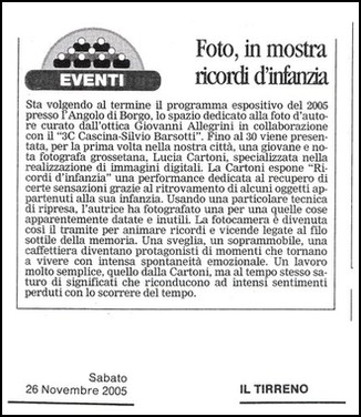 Ho esposto dal 1 al 30 novembre 2005 all’”Angolo di Borgo” con la mostra "RICORDI D'INFANZIA" L'Angolo di Borgo è uno spazio espositivo attivo nella città di Pisa da oltre un quarto di secolo. Si trova in Borgo Stretto, nel cuore antico della città, presso lo storico negozio di Foto-Ottica “Giovanni Allegrini”. E’ fruibile 24 ore su 24, 365 giorni l’anno: una galleria non-stop che ogni mese propone i più importanti fotografi italiani, registrando ampi consensi dagli appassionati, dagli organi d’informazione e dal mondo culturale cittadino.