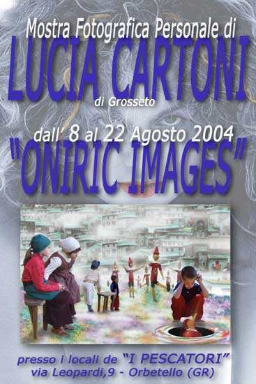 Dall' 8 al 22 Agosto 2004 presso i locali de "I Pescatori" situato a Orbetello (GR), ho esposto una nuova personale fotografica dal titolo "Oniric Images". La mostra presentata quest’anno vuole essere un resoconto del mio operato che spazia dai primi, fino agli ultimi ed inediti lavori, molti dei quali sono stati premiati ed ammessi ai concorsi nazionali e internazionali. Erano in mostra 30 fotografie, suddivise in 3 sezioni di 10 foto ciascuna: