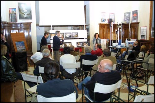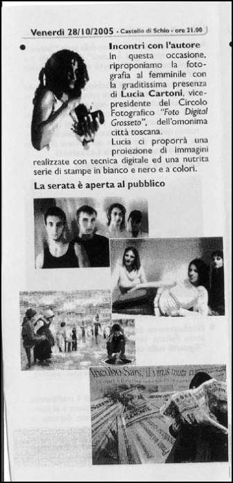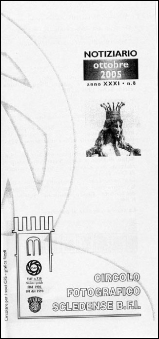 Venerdì 28 Ottobre 2005 si è svolta nella suggestiva ambientazione del Castello di Schio (VI), sede del circolo Scledense, la mia prima serata d'autore. La serata è iniziata con una mia breve presentazione, seguita successivamente da una proiezione di immagini digitali della durata di 15 minuti circa e dalla presentazione di 3 serie ciascuna di 10 stampe: elaborazioni, il gay pride e i ricordi d'infanzia, con relativo dibattito. In conclusione abbiamo visionato il sito dell'associazione soffermandoci sul Fotomutando e su alcune fotogallerie di alcuni soci. Di seguito, una serie di immagini riguardanti la serata.