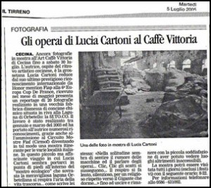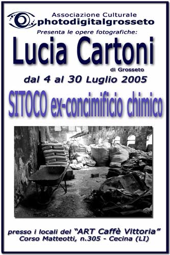 Dal 4 al 30 Luglio 2005 presso i locali dell' Art Caffè "Vittoria" di Cecina (LI) (Corso Matteotti n.305), Sono stata invitata ad esporre una mostra personale fotografica. Ho presentato un reportage di 20 fotografie realizzato in una vecchia fabbrica dismessa di concime chimico situata in riva alla Laguna di Orbetello: la SI.TO.CO. Il lavoro è stato realizzato tra gennaio e marzo del 2003 e mi ha portato numerosi riconoscimenti, numerose le mostre che sono state ospitate in tutta Italia grazie anche all’ammissione al Circuito Mostre Fiaf (Cirmof) diventando in tal modo una mostra itinerante per le varie località italiane. Inoltre nell’estate 2004 è stata esposta nell’ambito del prestigioso Toscana Fotofestival di Massa Marittima (GR). In questo piccolo ma affascinate viaggio in cui immagino di trasprtarvi in punta di piedi all’interno del “mostro ecologico” che sovrasta la meravigliosa laguna Orbetellana si respira l’aria della vita trascorsa… come scrivo: “Nella solitudine sembra di sentire il rumore delle macchine ed il parlare degli operai… Clic,,Clic gli scatti si susseguono… Il respiro si fa lento, silenzioso, per un religioso rispetto verso il Gigante che dorme…” fino ad uscire e rimanere con la piccola soddisfazione di aver potuto vedere e visitare luoghi altrimenti inaccessibili, nascosti alla vista dei più, luoghi dove rimangono poche tracce della vita lavorativa, luoghi dove il degrado e l’inquinamento hanno preso il sopravvento, ma con la piccola soddisfazione di dire: “un giorno quando tutto questo non ci sarà più: io c’ero ed ho potuto vedere e fermare nella mia mente, e nei miei fotogrammi questo piccolo affascinante mondo segnato dal tempo”.